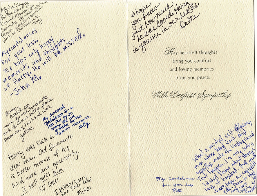 The loss of Harry Gobler is felt throughout the Old Sacramento Historic District. We join his family in fondly remembering this truly humble and generous man.